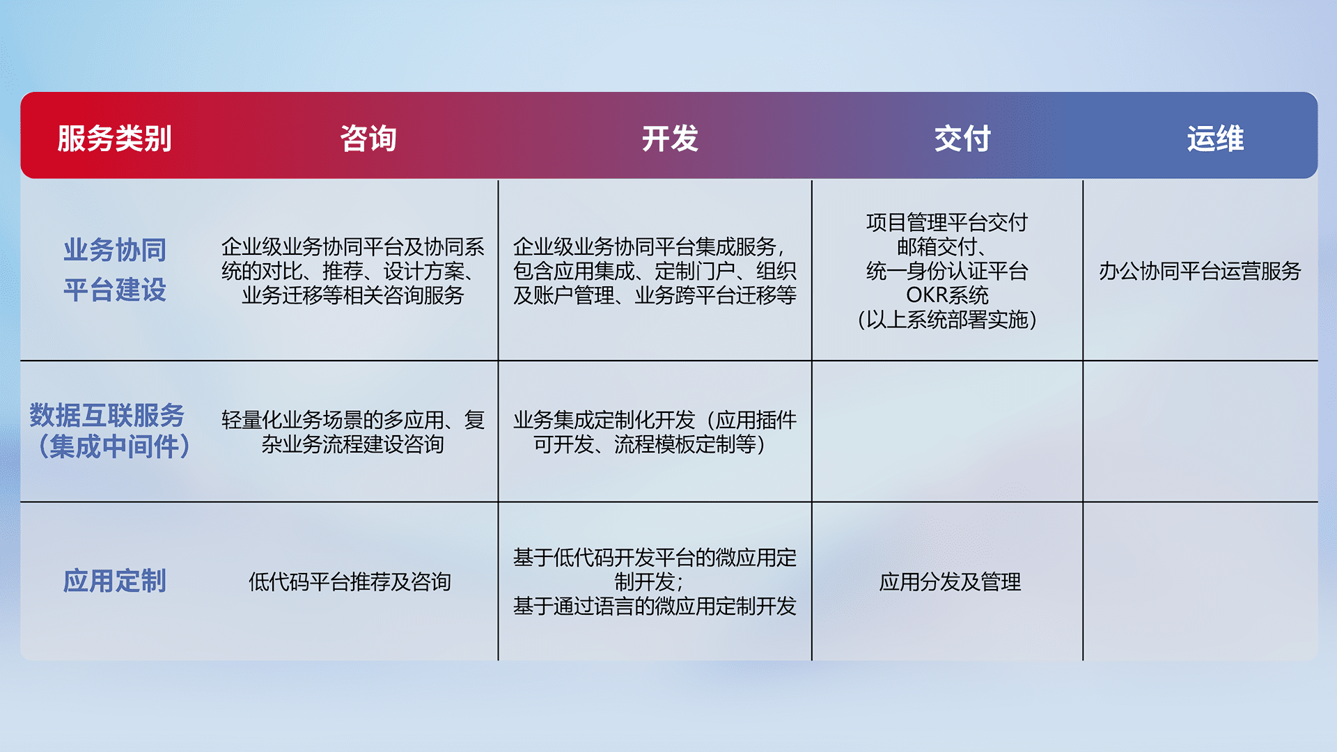 针对钉钉、、企微、、、IDaas等平台级产品提供产品的规划、、方案、、、交付、、、、定制化开发等服务,,实现如统一协同办公、、智能客户服务、、、混合会议管理、、、智能数据查询、、、等业务场景,,,,实现数字化转型。。。。
